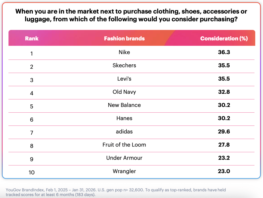 New rankings show Nike holding the top spot among US fashion brands, with athletic and heritage players continuing to lead the category.