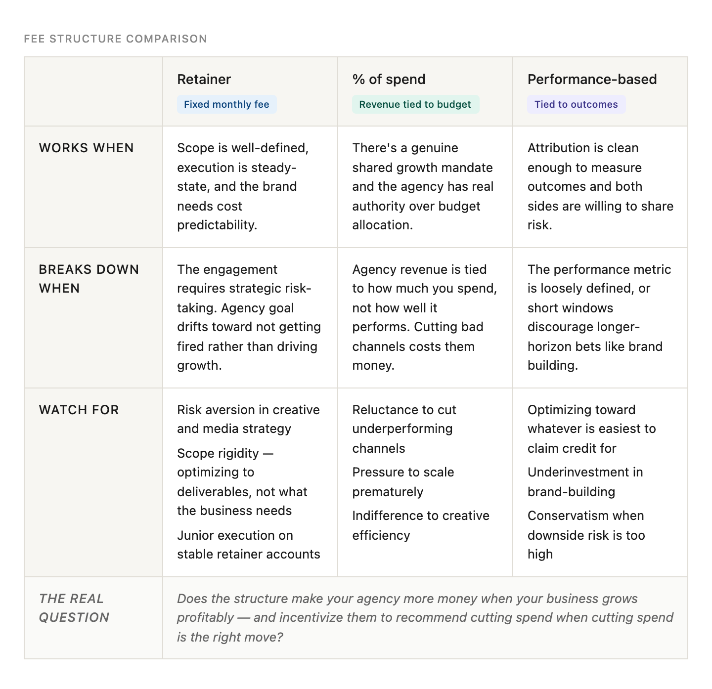 Does your agency's compensation structure make them more money when your business grows profitably? Does the structure incentivize the agency to recommend cutting spend when cutting spend is the right move? Is there a mechanism for the structure to evolve as the engagement matures? Would the agency voluntarily propose restructuring their own compensation if the current model wasn't producing the right behaviors?