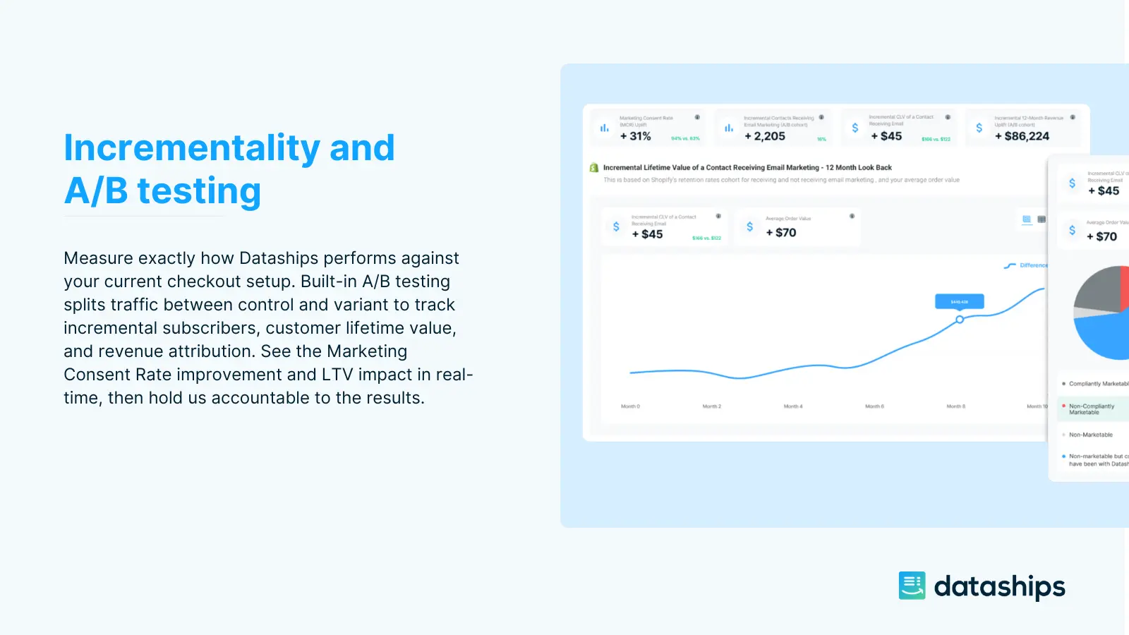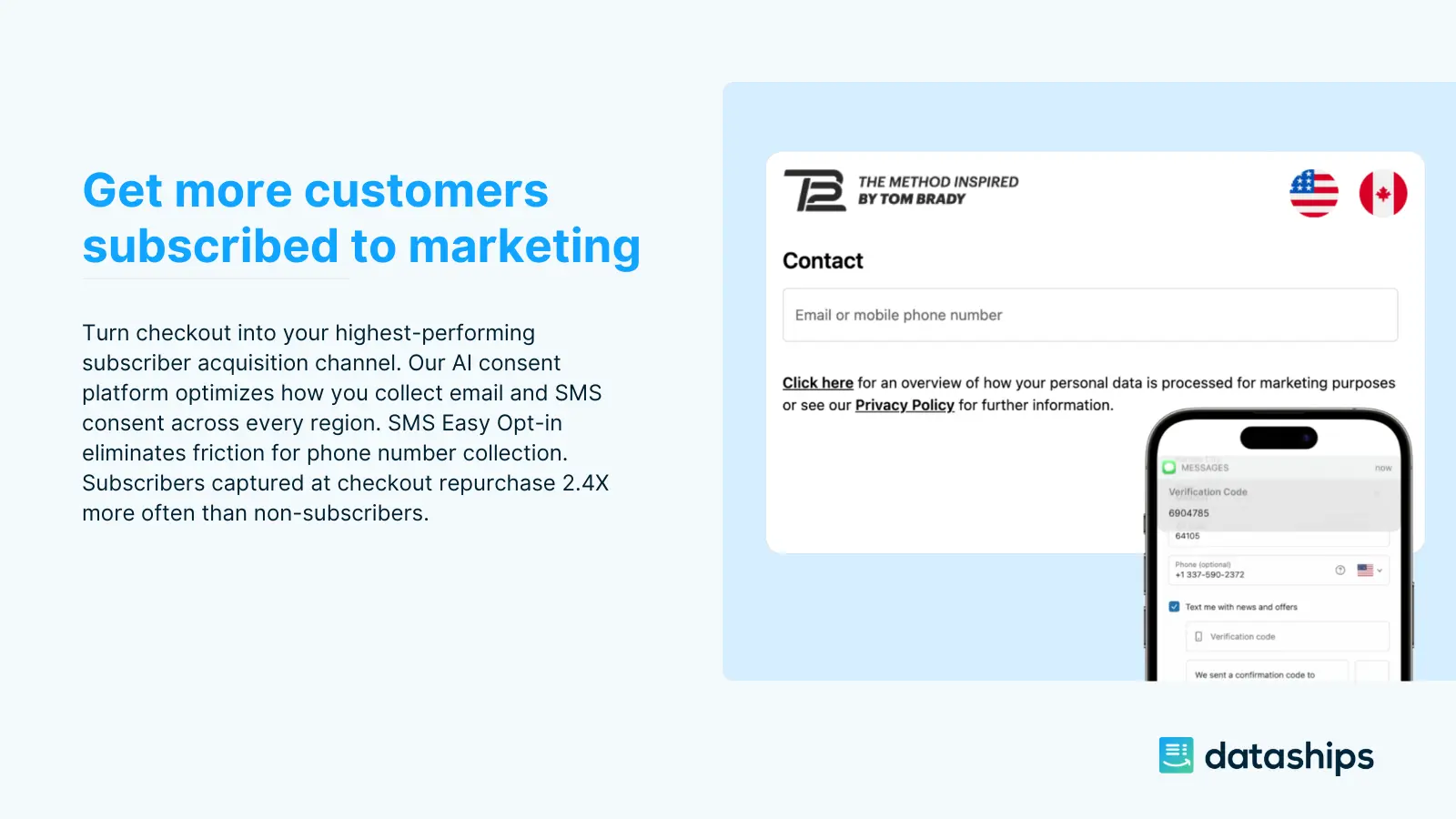 Dataships is an AI consent optimization platform for Shopify brands. We maximize the percentage of your paying customers who opt in to email and SMS marketing at checkout — compliantly, globally, and at scale. AI trained on 50M+ consent interactions across 600+ brands determines the optimal opt-in experience for each buyer in real time.