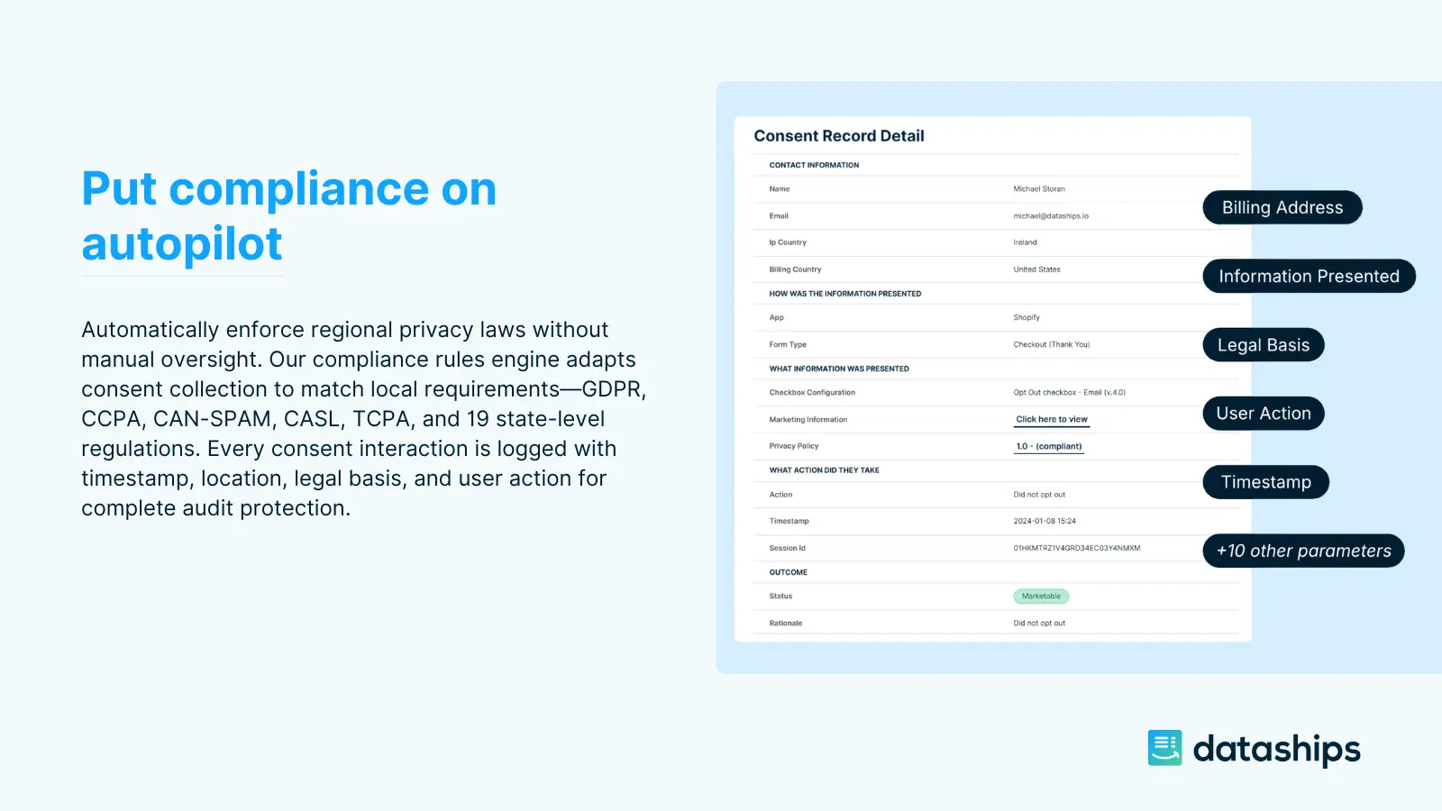 Every country has different consent rules. France requires explicit opt-in. Germany recently dropped double opt-in. 19 US states now have their own privacy laws. Dataships handles all of it automatically — adapting consent forms in real time based on each buyer's location. Your team never has to research regional requirements or manually update checkout settings again.