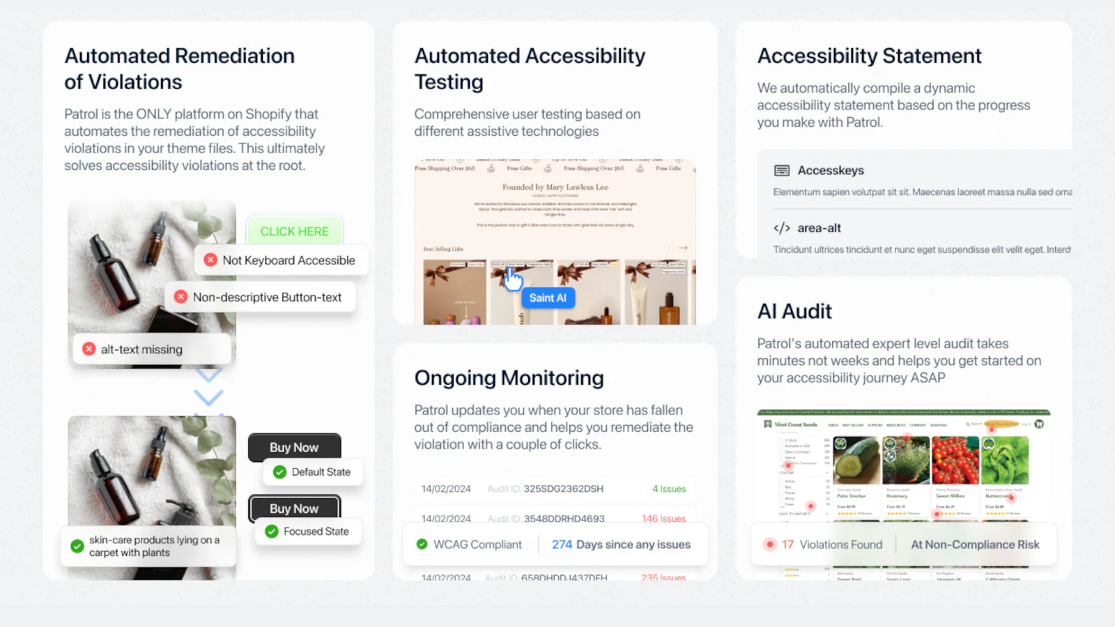 Patrol automatically audits, tests, and resolves accessibility violations at the code level with AI. It syncs to your live Shopify theme every hour, catching any new violations that are introduced, helping brands stay in compliance and avoid future lawsuits.